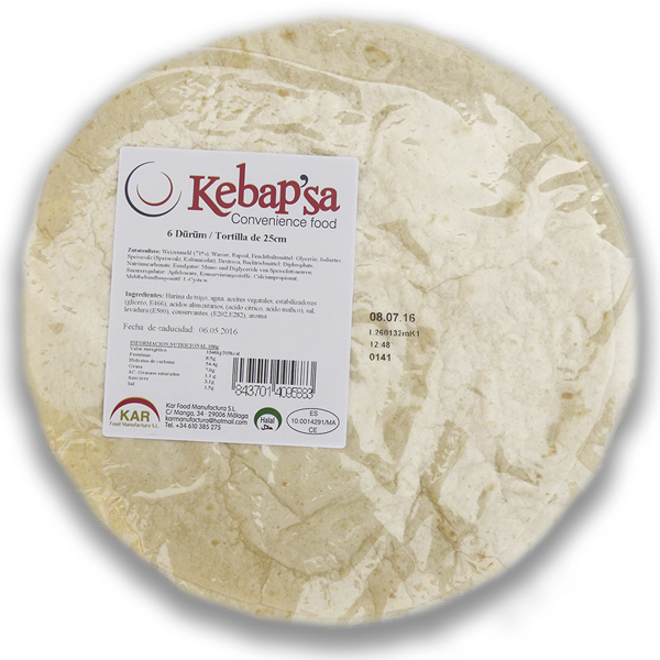 Dürüm/Tortilla calentarlo en una sarten, plancha o en horno de 1-2 min y rellenar con ensalada y carne Kebap.